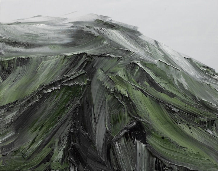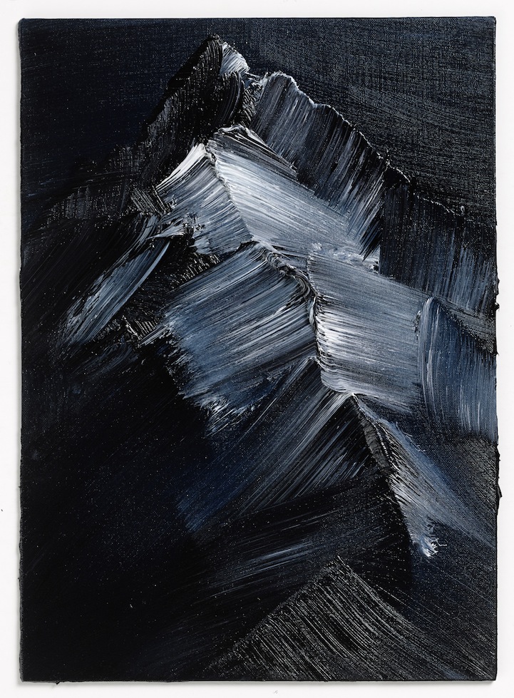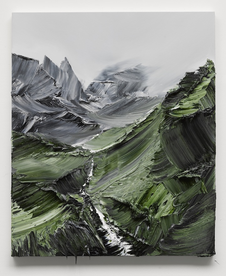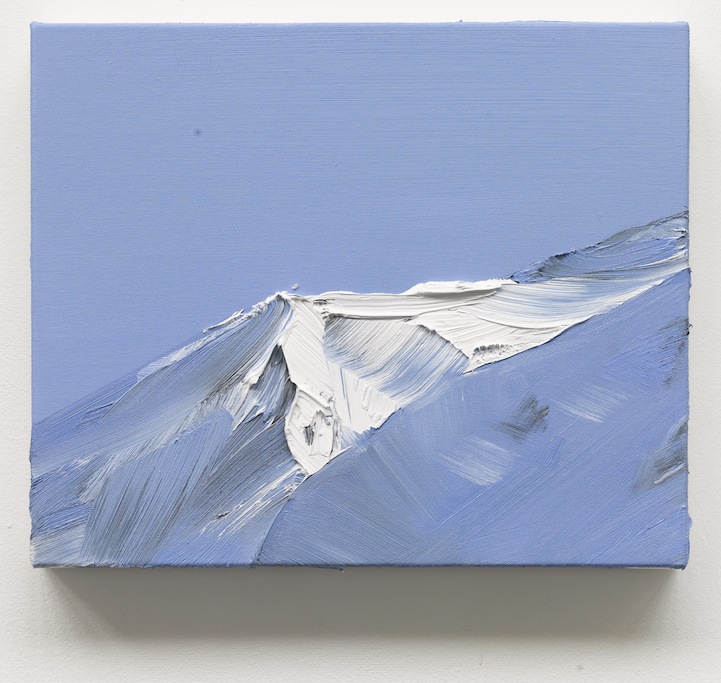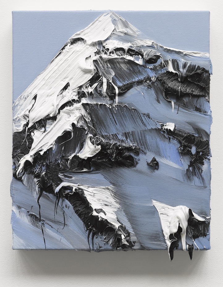 Takmer náhodný mix množstva modrej, bielej a čiernej farby stekajúcej z plátna vytvára ilúziu skutočných majestátnych hôr. Vizuálny trik umelec používa k vytvoreniu dokonalých obrazov, ktoré vás po jedinom žmurknutí oka zavedú priamo k mocným štítom švajčiarskych álp.