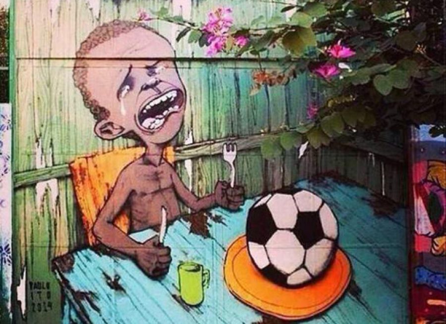 Pouliční umelci, uvedomujúci si závažnosť týchto problémov, pokryli steny v Rio de Janeiro a Sao Paulo obrázkami, ktoré obviňujú riadiace orgány FIFA za využívanie Brazílie a miestnu vládu za zanedbávanie potrieb chudobných. Street art vyjadruje pobúrenie nad majstrovstvami, ktoré zanechajú ich krajinu v nie práve najlepšom stave. Takéto jednorazové športové podujatia sú len akýmsi divadlom ktoré príde do mesta, vyšťaví ho a zanechá síce s novými športovými zariadeniami, ale súčasne aj kolabujúcimi nemocnicami a školami. World Cup stojí Brazíliu neuveriteľných 11 miliárd amerických dolárov. Je preto pochopiteľné rozhorčenie miestnych obyvateľov, ktorých hnevá sledovať, ako sú ich dane míňané na drahé štadióny, zatiaľ čo ľudia žijú v chudobe obklopení drogami a násilím. Zamyslite sa nad tým, je to skutočne veľmi silné posolstvo.
