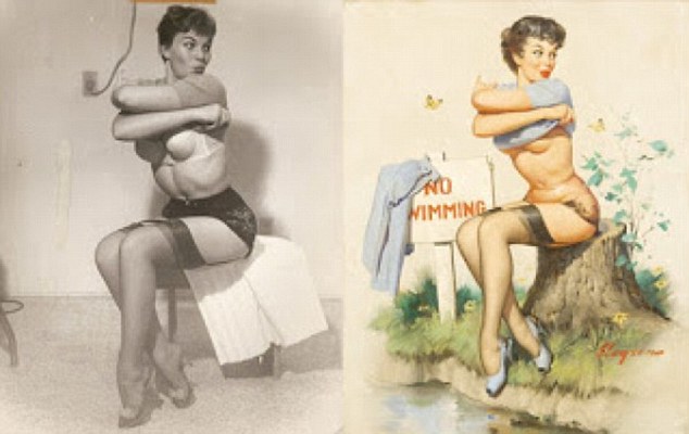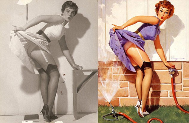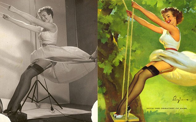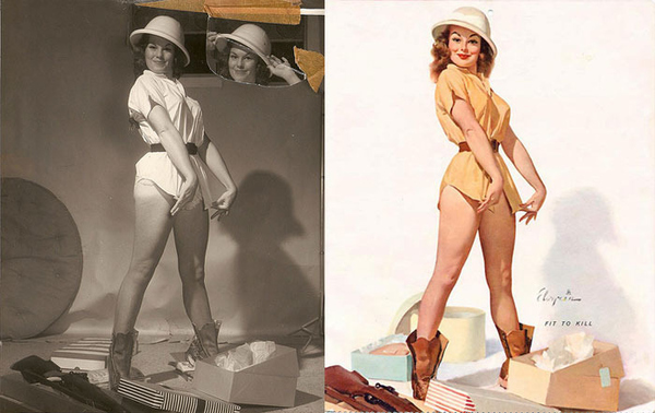 Autorom týchto obrazov z päťdesiatých rokov je Gil Elvgren. Zistilo sa, že jeho diela neboli len výplodom fantázie. Obrazovou predlohou boli fotografie žien, ktorých výzor sa síce zjavne odlišuje od tých z malieb, avšak pózy a výrazy tváre sú totožné. Umelec im zjemnil črty tváre a ubral, či pridal na tých správnych miestach. Môžeme povedať, že šlo o akéhosi predchodcu photoshopu.