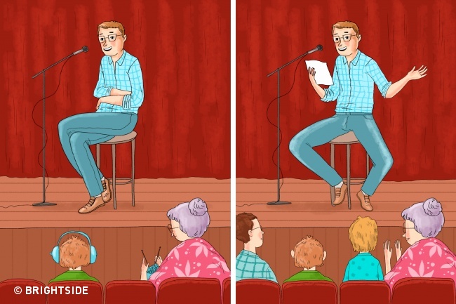 Prekrížené ruky, zlé držanie tela a nevýrazné gestá ľudí odrádzajú a nudia. Skús sa postaviť pred zrkadlo, uvoľni sa a skús si konverzovanie pred zrkadlom. Výsledky ťa prekvapia. POZOR! S gestami to však nepreháňaj, pretože neprirodzené gestikulovanie ľudí odstraší.