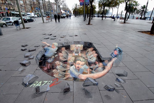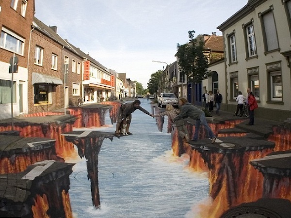 Tieto očné klamy vznikli pod rukami umelca Juliana Beevera. Britský maliar sa zaoberá 3D maľbou, ktorú aplikuje na chodníky v rôznych mestách. Pre jeho diela ho nazývajú Chodníkový Picasso. Pri pohľade na niektoré z nich sa vám na okamih zastaví srdce.