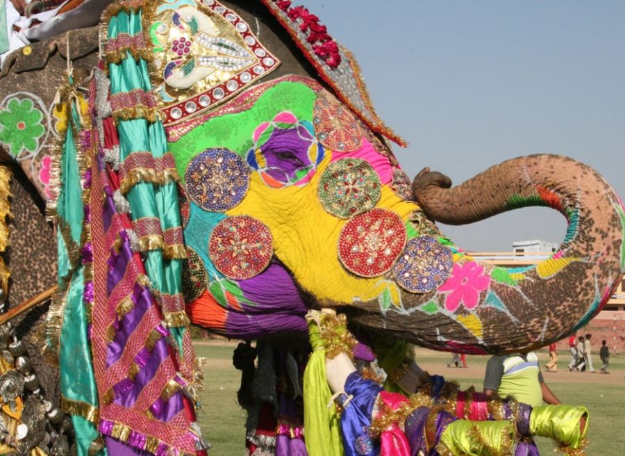 Sloní festival, Jaipur, India. Slony sú pre indickú kultúru veľmi dôležité. Preto ich v krajine oslavujú Festivalom slonov, ktorý sa koná v marci. Čo znamená, že sú tieto milé stvorenia vyobliekané do rôznych farebných hábov a nechýbajú im ani početné výrazné šperky.