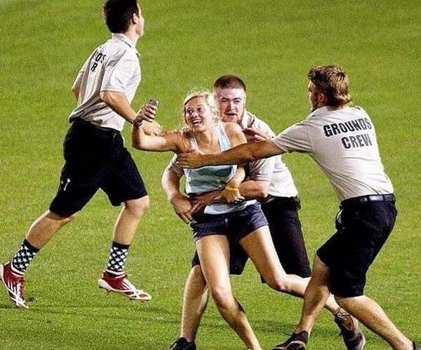 2.Kayleigh Hill sa počas College World Series 2013 rozhodla vbehnúť na trávnik baseballového ihriska a spraviť si fotku, akú nikto iný určite mať nebude. Veď kto už sa len môže pochváliť selfie fotkou z dôležitého zápasu, počas ktorého nechytajú obrancovia loptu alebo vás?