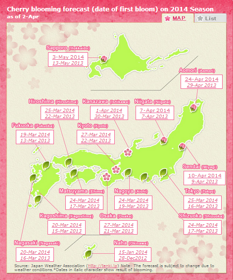 Jemne ružové sakury, ako Japonci nazývajú kvety tradičnej japonskej čerešne, rozkvitajú každú jar a celej krajine dajú rozprávkový nádych. Kvitnúť začínajú v apríli, keď sa študenti vracajú po prázdninách späť do školy. Dokonca aj japonská národná meteorologická služba sleduje pohyb „sakura frontu“, čo je vlastne pomyselná čiara, ktorá smeruje z juhu na sever a každý rok ohlasuje kvitnutie sakury v celej krajine. Jej priebeh je možné sledovať priamo na kalendári stránky japonskej národnej organizácie cestovného ruchu (jnto.go.jp).