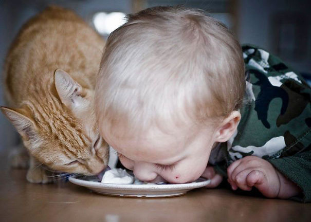 Poznáte to: niečo naučí dieťatko psíka, niečo zase psík dieťatko. A keď ide o stolovanie, radi sa najedia aj spolu z jednej misy.