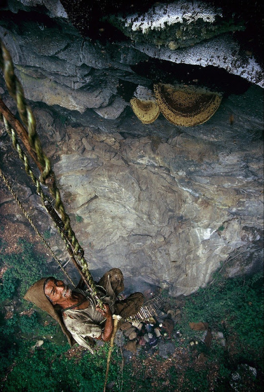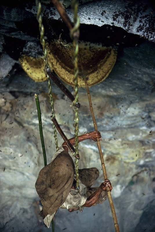 Zbieranie medu sa zvyčajne koná dvakrát do roka a má presné postupy. Rituál sa začína modlitbami a odovzdaním obete v podobe kvetov, ryže a ovocia. Potom sa zapáli oheň, aby dym vyhnal včely z úľov. A napokon sa zberači pripevnení lanami spúšťajú po rebríkoch k plástom plným medu, ktoré zbierajú do košíka. Podotýkame, že nemajú na sebe žiaden včelársky výstroj.