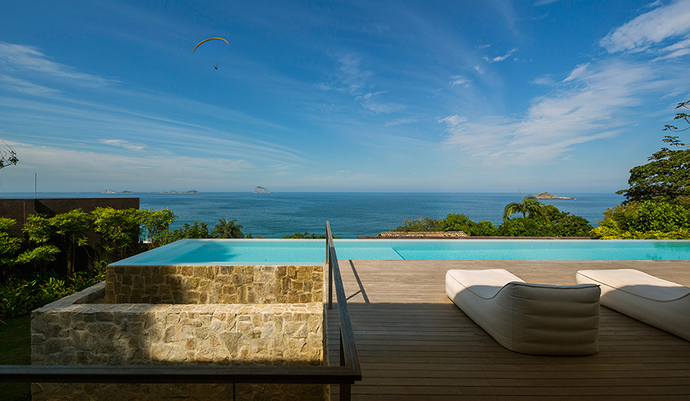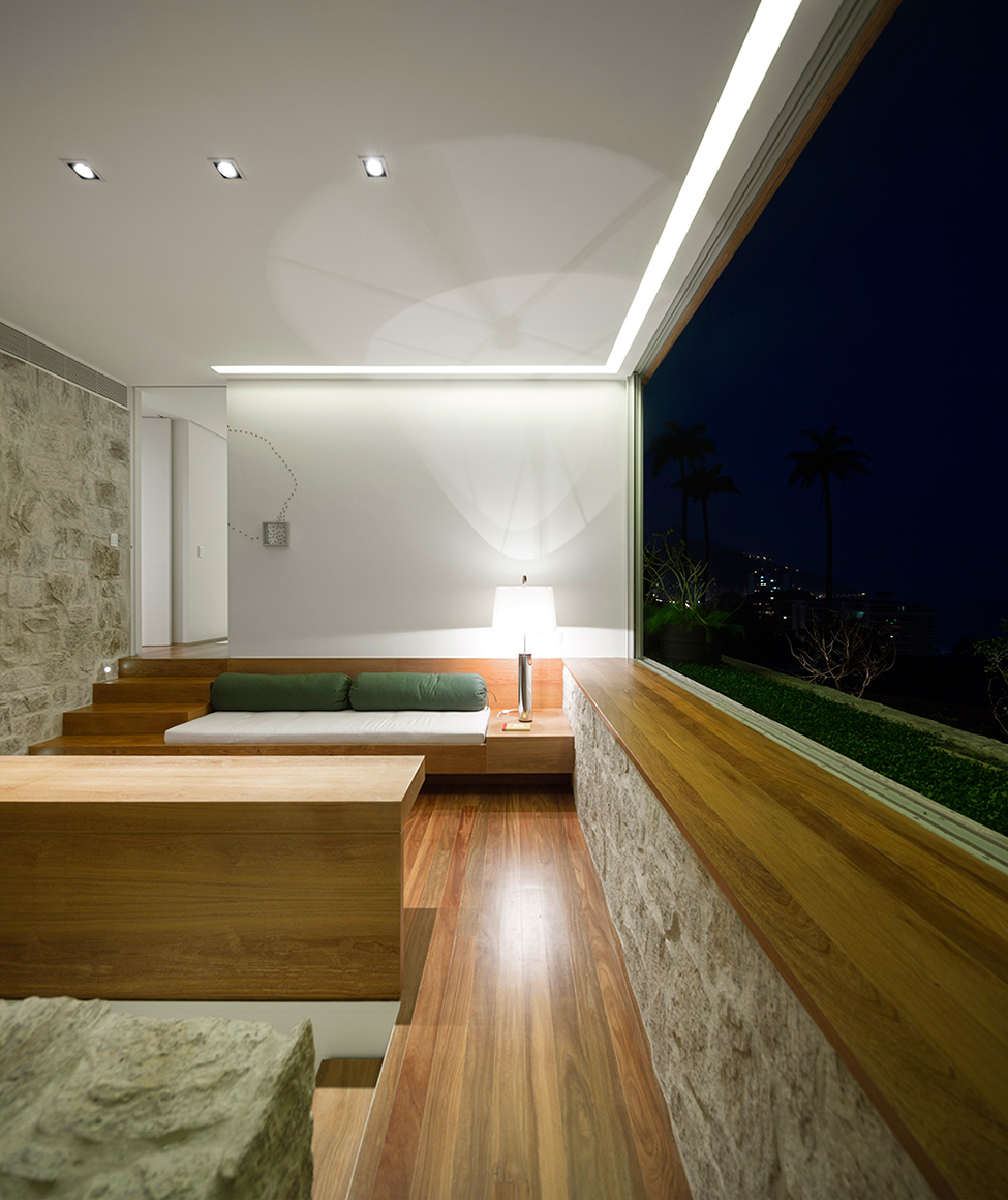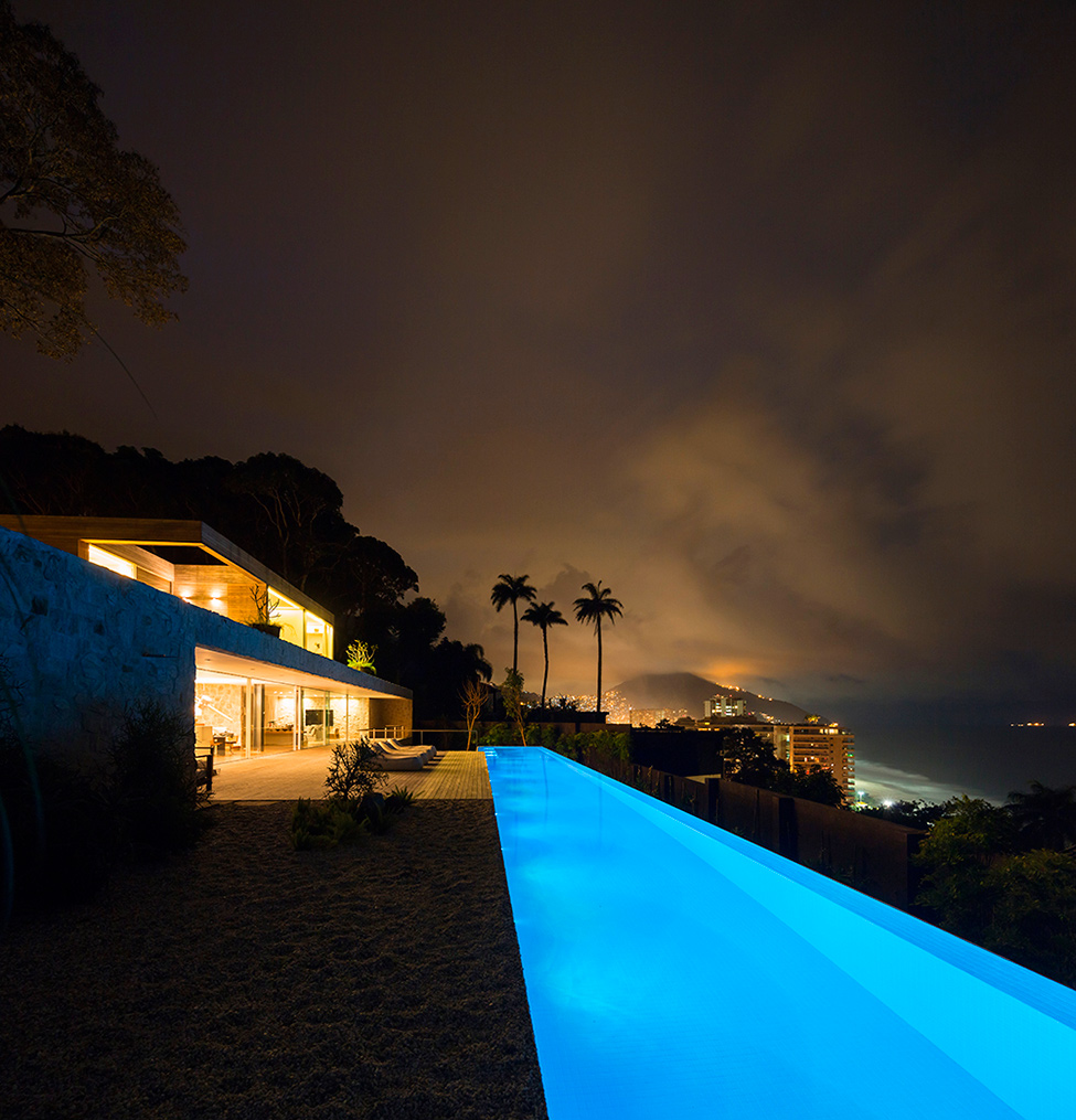 Studio Arthur Casas navrhlo tento dom tak, aby zahŕňal pohodlie, eleganciu a predstavoval súkromné nebo na zemi. Obklopuje ho stále zelená vegetácia, Cumaro drevo a nádherný výhľad priamo na tyrkysovo modrý oceán. Dve hosťovské izby a ďalšie dva apartmány pre slúžku a záhradníka sa nachádzajú hneď na prízemí, zatiaľ čo na poschodí sa akoby vo vitríne rozprestiera obrovská spálňa s panoramatickým výhľadom na oceán.