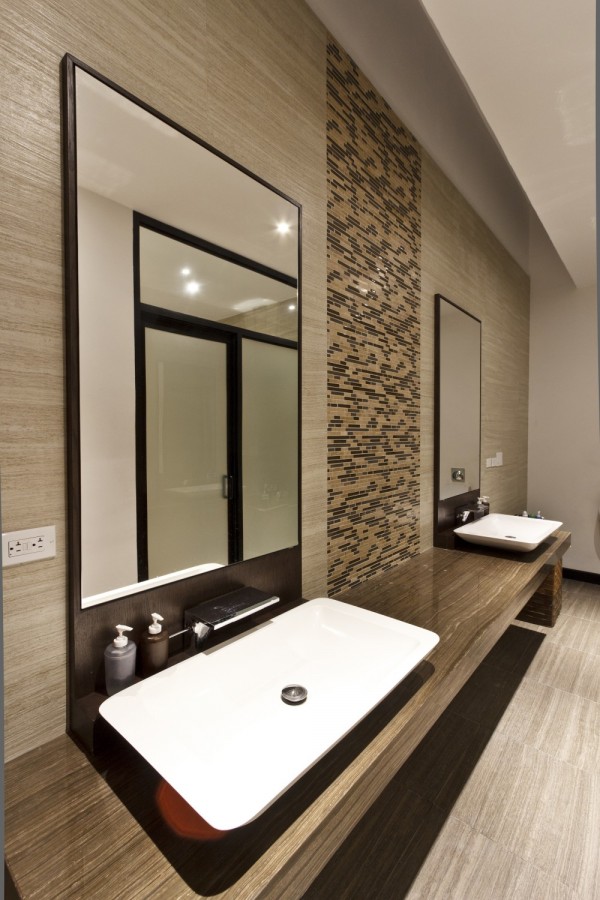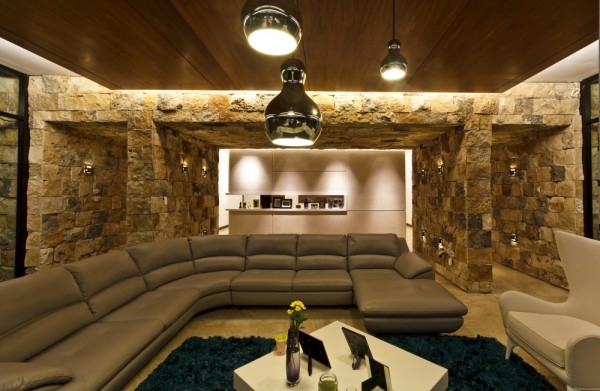Prepojenie vonkajška s vnútrom je prítomné prostredníctvom materiálov (drevo a kameň) a prírodných prvkov ako jazierko na chodbe či kamene pri schodisku. Všadeprítomný výhľad na zeleň zabezpečujú obrovské okná nasmerované do záhrady. Drevená podlaha či kamenné steny sú alfou a omegou v tomto projekte. Zemité farby, ktoré prevládajú aj v interiéri nám opäť evokujú tému prírody.