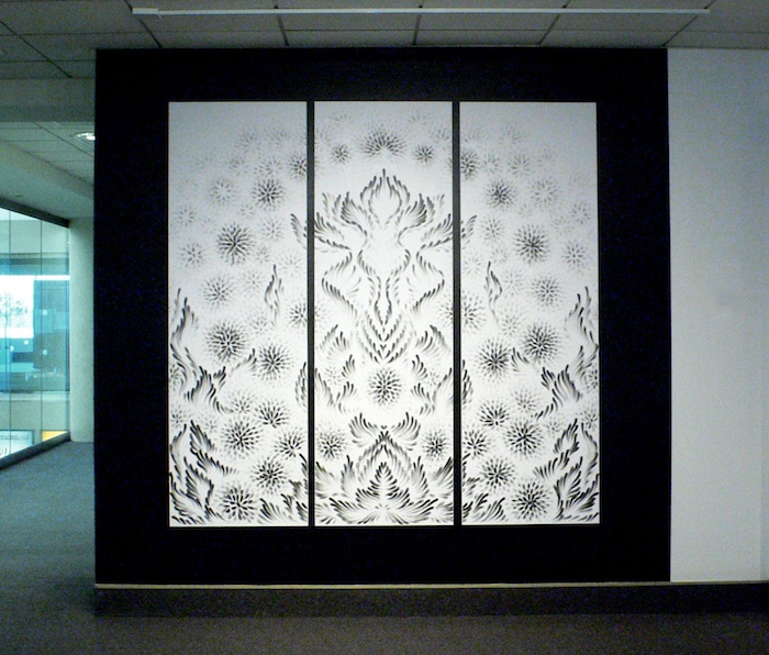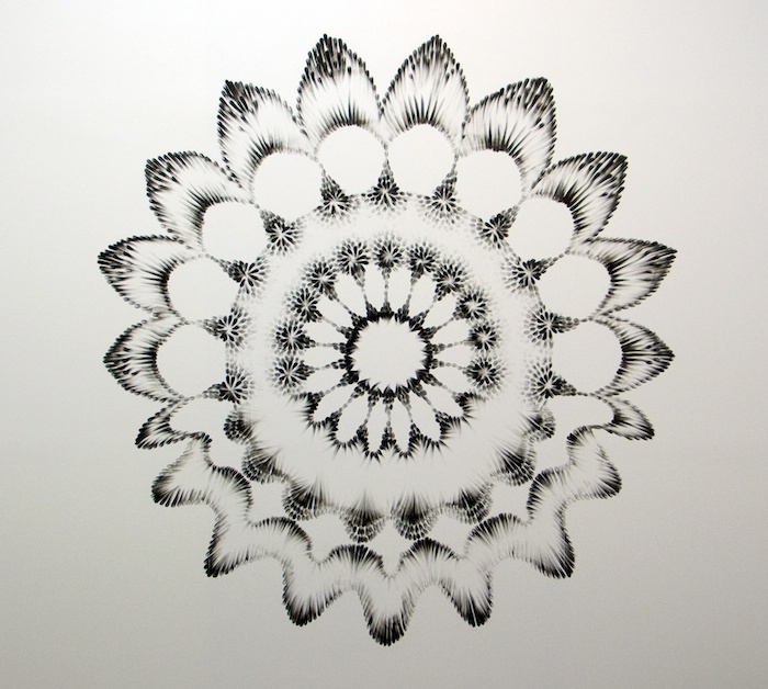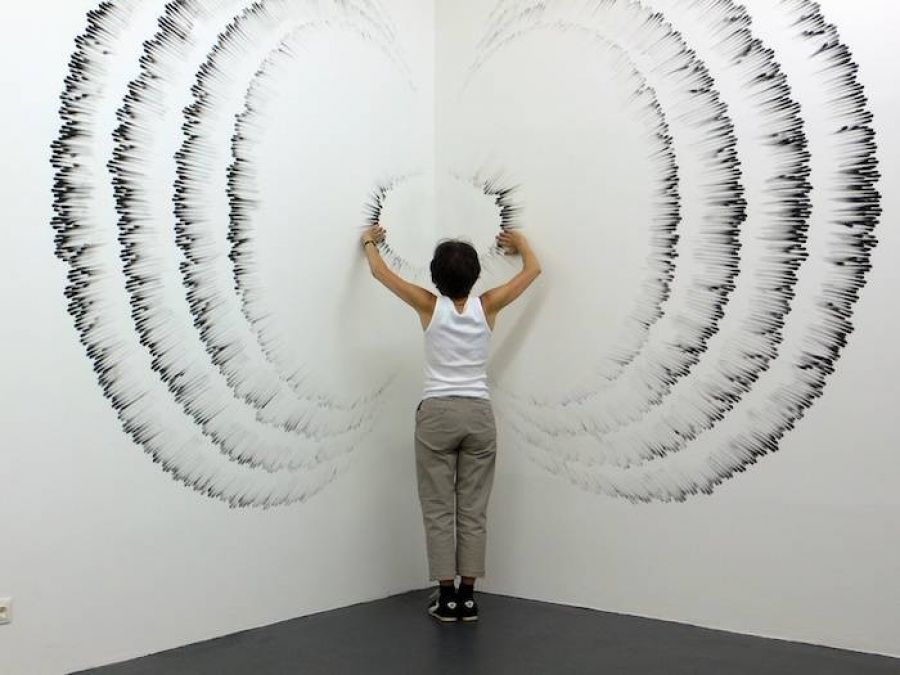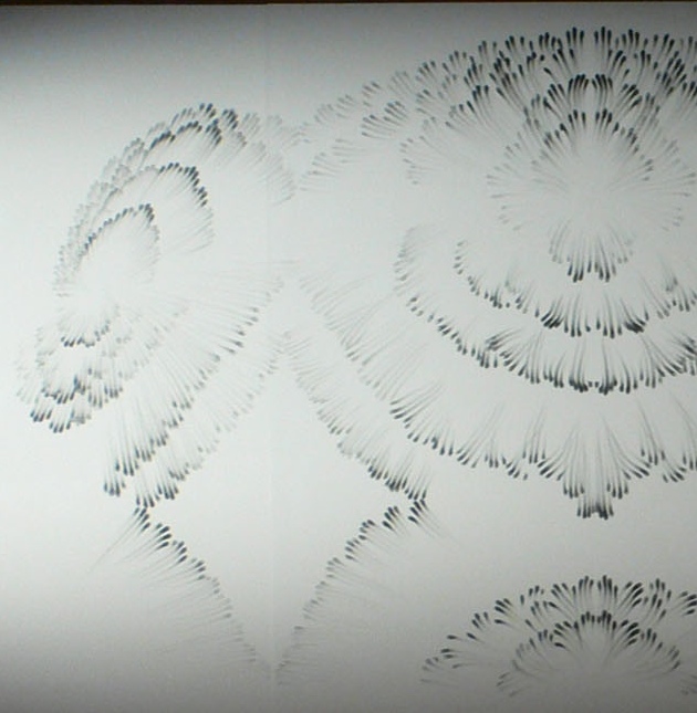 Na tom by nebolo nič zaujímavé, avšak jej pracovným nástrojom sú prsty namáčané v rozdrvenom uhlí alebo grafite. Podkladom je čistá biela stena, a tak vznikajú nezvyčajné maľby kontrastnej čierno-bielej farby.