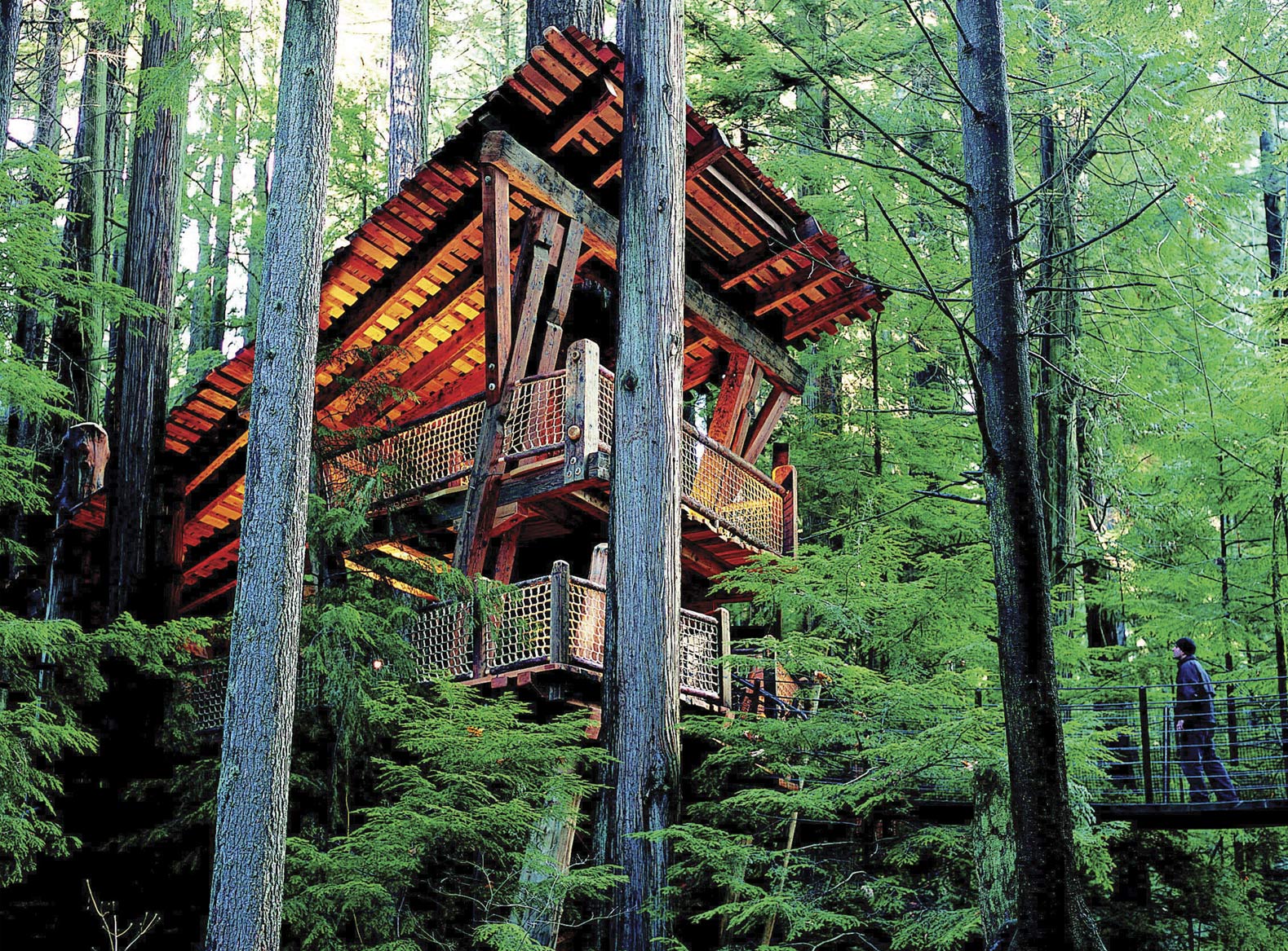 Treetops Adventure predstavuje sériu siedmich mostíkov, ktorá prevedie turistov ponad dažďový prales západného pobrežia. Chodníky sú pripevnené k ôsmim 30 tonovým, 250 rokov starým jedlám a tvoria ako keby „náhrdelník“ okolo stromov, ktoré sú nastaviteľné a pohyblivé a neobsahujú žiadne klince ani skrutky, ktoré by prenikali do stromov a tým ich poškodzovali. Keďže stromy za posledných desať rokov narástli nielen do výšky, ale aj v obvode, treba im uvoľniť golier a posunúť ho vyššie. To znamená, že návštevníci si budú môcť vychutnať ešte vzrušujúcejší pohľad na krásy parku z výšky 33,5 metra.