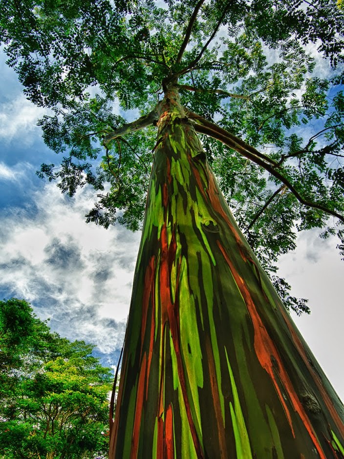 Dúhový eukalyptus v Kauai, Hawaj - dúhový eukalyptus, ktorý rastie po celom južnom Pacifiku, je užitočný a krásny súčasne. Je cenený pre krásne farebné škvrny zanechávané pri odpadávaní kôry a tiež pre vlákna, ktoré sa používajú na výrobu papiera.
