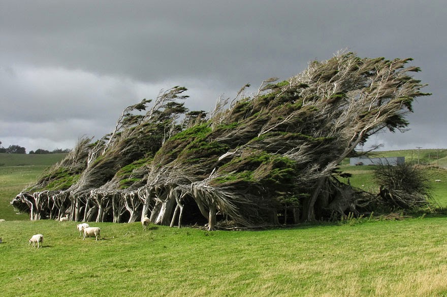 Strapaté stromy na Novom Zélande - tieto stromy v Slope Point, najjužnejšom cípe Nového Zélandu, rastú pod takýmto uhlom, pretože sú neustále zmietané extrémnymi antarktickými vetami.