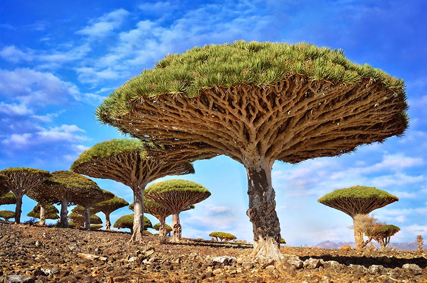 Dragonblood Trees, Yemen - Stromy dračej krvi získali svoje hrôzostrašné meno vďaka karmínovo červenej miazge, ktorá sa používa ako farbivo, huslí lak, alchymistická ingrediencia a ľudový liek na rôzne neduhy.