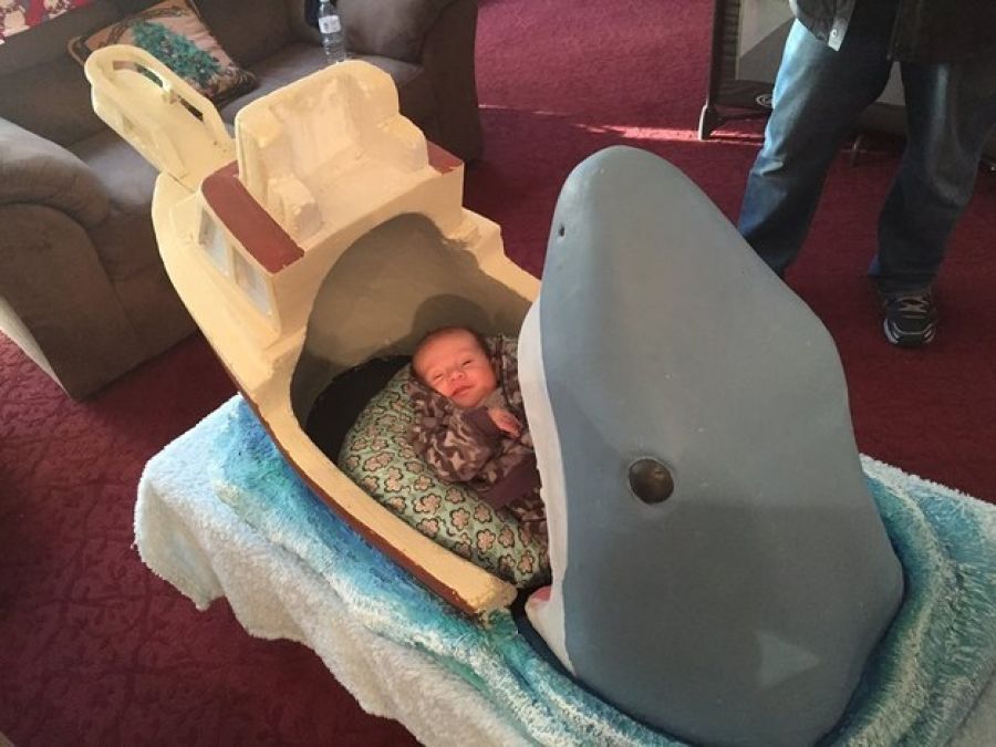 Otec dáva spať svoje bábätko do čeľustí žraloka.