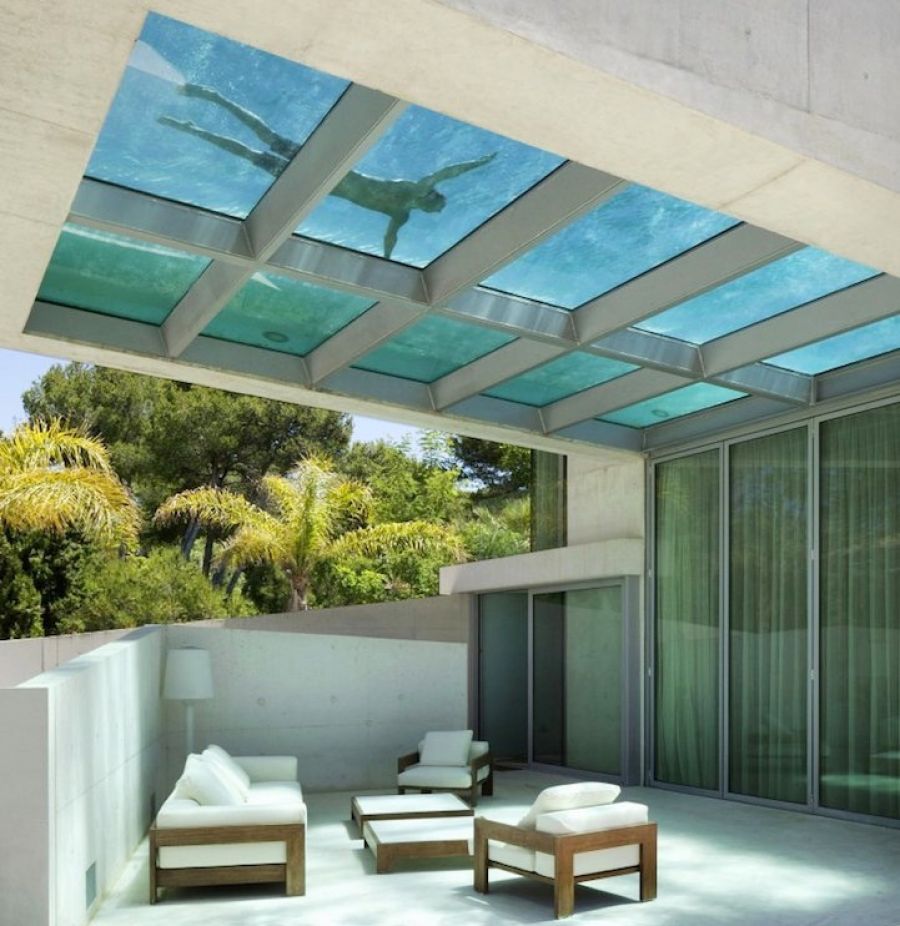 Ohromujúci nekonečný bazén s výhľadom na juhozápad s pohorím Sierra Bianca v diaľke sa prelína s horizontom krásne modrého mora. Aj napriek svojej hmotnosti 66 ton sa môže pochváliť ešte niečím nezvyčajným. Dno bazéna je totiž presklené a vytvára panoramatické okno priamo do interiéru domu. To umožňuje plavcom nahliadnuť rovno do kuchyne a naopak, počas relaxácie v príjemne chladnom interiéri sledovať, kto sa práve nachádza v bazéne.