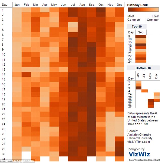 Podľa grafu, ktorý ukazuje každý jeden deň v roku od 1. januára až do 31. decembra, môžeme jednoducho zistiť, ktoré dni sú tými najčastejšími narodeninovými. Vďaka tmavým a svetlým štvorčekom, ktoré označujú jednotlivé dni vidíme, v ktorom období sa v USA narodilo najviac detí a takisto ktoré dni sú najzriedkavejšími, čo sa týka narodeninových osláv.