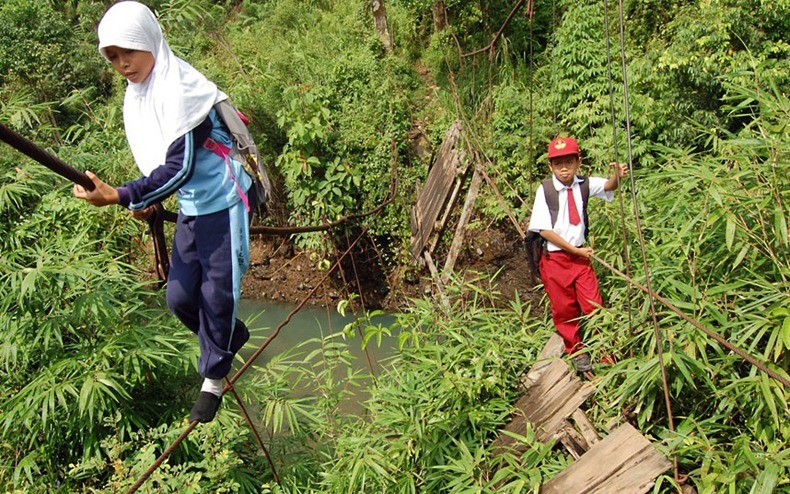 Žiaci z dediny Batu Busuk na Sumatre cestou do školy, ktorá sa nachádza v najbližšom meste Padang, musia prejsť po železných lanách upevnených 9 metrov nad riekou a potom prejsť peši ešte 11 kilometrov po dažďovom pralese. Most, ktorý spájal brehy rieky zničili pred dvoma rokmi husté dažde.