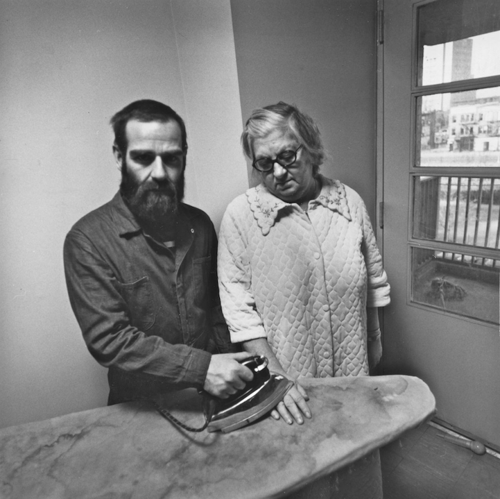 Bradatý muž žehlí ruku starej mame