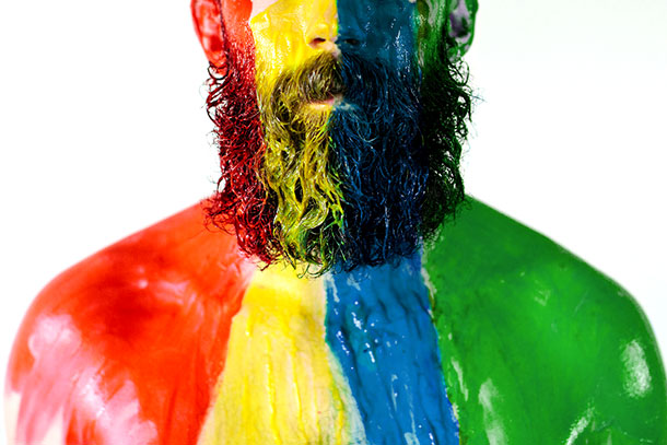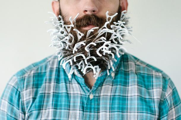 No nie sú to také obyčajné fotografie.Každou snímkou ukazuje, čo všetko sa dá na jeho bradu prilepiť, zavesiť alebo do nej zapichnúť.