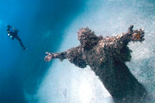 Áno skutočne je to tak. Bronzová socha Ježiša Krista sa nachádza sedemnásť metrov pod morskou hladinou v zátoke San Fruttuoso Camogli v Stredozemnom mori, medzi Camogli a Portofino na Talianskej riviére.